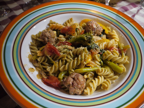 因為算是小店,所以只有一般的麵條,有點可惜。義大利麵條有寬麵,螺旋麵,蝴蝶麵,貝殼麵......。這次把拔給主廚出了一道考題,把拔去裕毛屋買了三色螺旋麵請主廚做,主廚於是用現成的菜單上的食材做了一道蔬菜肉丸子螺旋麵,含有菠菜,非常的營養。