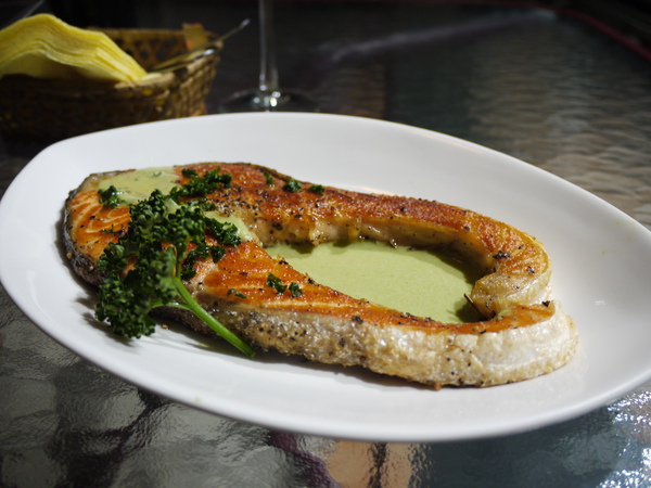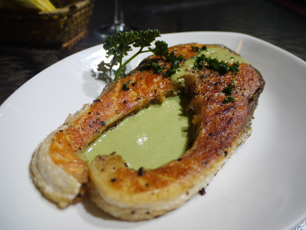 魚排我要求用主廚比較擅長的手法,煎魚的味道香香酥酥的,我很喜歡,搭配青醬,淡淡甜甜的,可以單純嚐嚐煎魚的味道,也可以沾一點微甜的青醬,或是配麵包也是不錯。