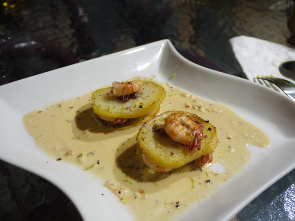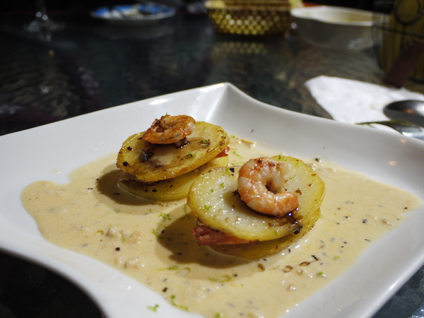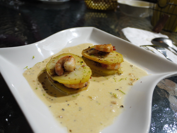 下一道菜,我所以寫蝦醬是一方面不希望模糊焦點,雖然這道前菜有添加鵝肝醬,我不希望模糊焦點,而且這道前菜主要的醬汁就是蝦醬。鵝肝醬我個人同意當作調味,但是製作的過程,真的不太人道,所以我的標題就不寫鵝肝,蝦醬本身就很夠味。