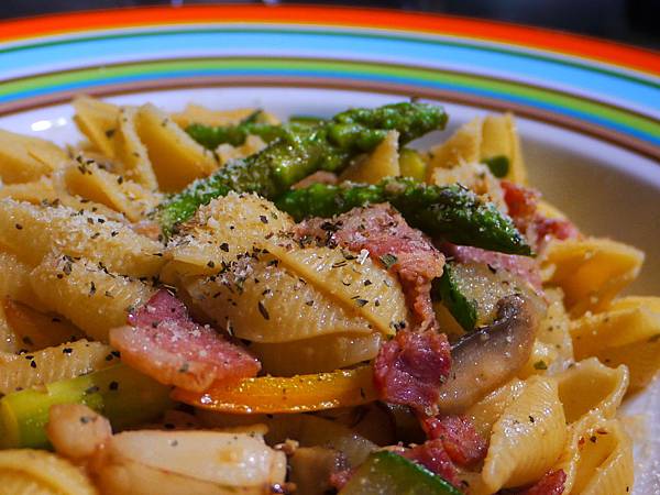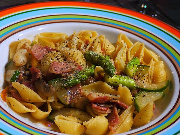 主餐是自備的貝殼麵,搭配培根蘆筍節瓜加上辣味的口感,視覺與口感兼具,很有特色。