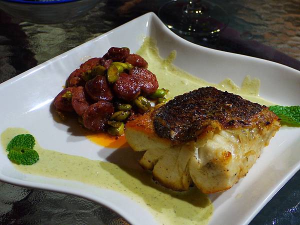 前菜是青醬香煎鱸魚,配上辣味香腸非常夠味。