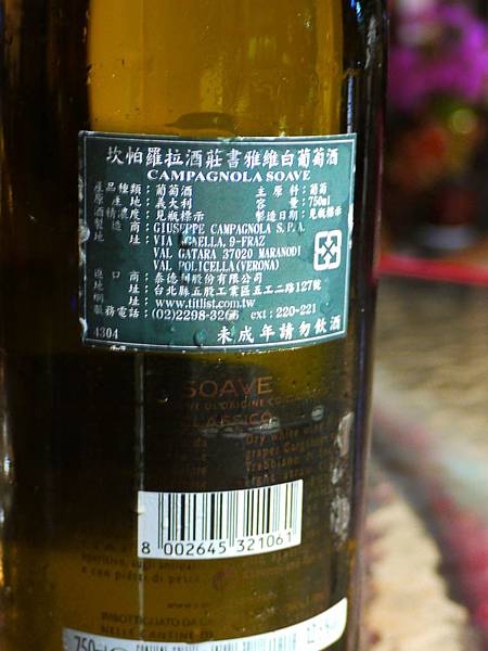 忘記寫白酒,只是義大利的酒很難去寫。每個酒莊有自己的配方,偏偏又不寫到底是Cabernet Sauvignon或是melot,若是要我寫,我只能寫者是一瓶dry的白酒,品質如何?讚啦!