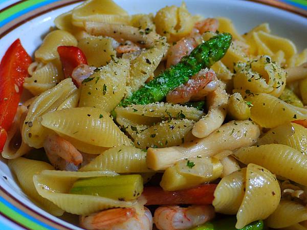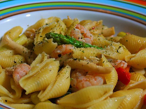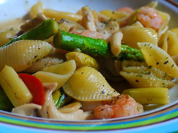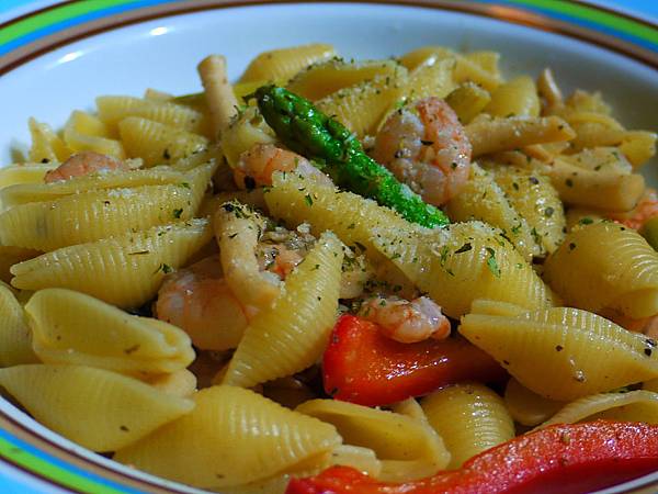 果然是知道有一點上年紀的人,清淡一點的好。所以,蝦仁,蘆筍,香菇,加一點點的橄欖油,就是簡單,健康的料理