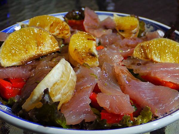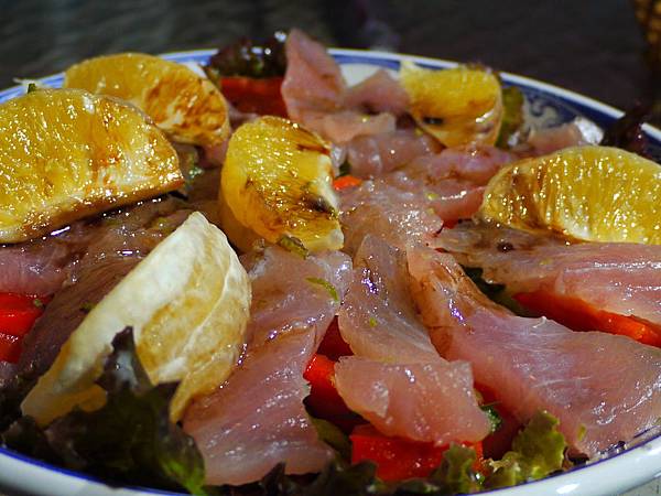 旗魚的厚度剛剛好,上頭有灑一點點岩鹽,有一點點的甜味,上面鋪上的柑橘正好是兩者明顯的對差而會有層次的感覺