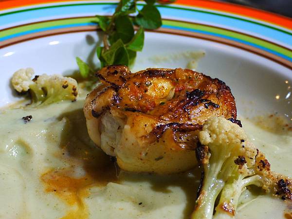 鹽烤的口味是清爽,脆脆的口感。若佐花椰菜泥,又參加一點點的薄荷,非常的清爽。