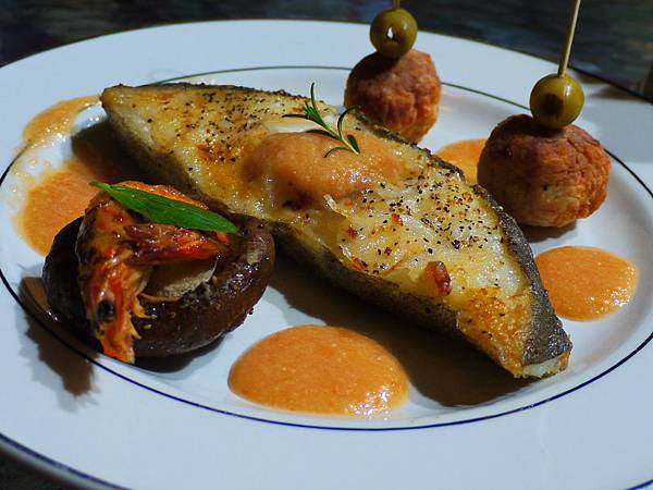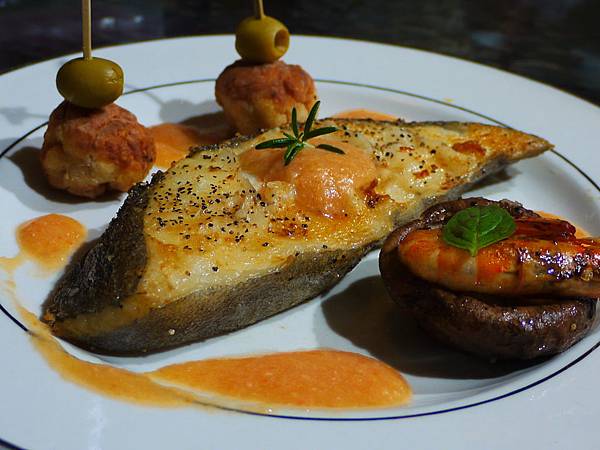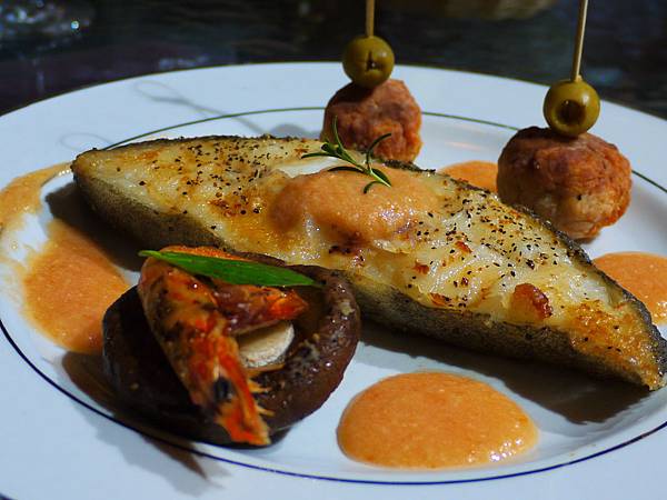 煎鱈魚是一定的。旁邊的擺盤,有一道是我們見過的小磨菇佐培根,上面添加的是香香酥酥的蝦仁。佐的醬汁是番茄,檸檬,柑橘,再加上橄欖雞肉丸子,非常的豐盛又海陸兼具。