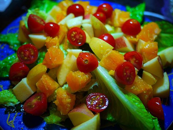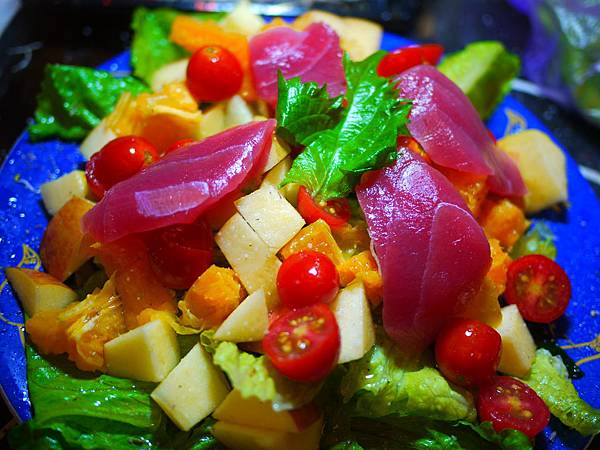 沙拉用的是毛豆,苜蓿芽,海帶芽,生菜,蘋果,柑橘,小番茄,鮪魚生魚片,色彩繽紛。