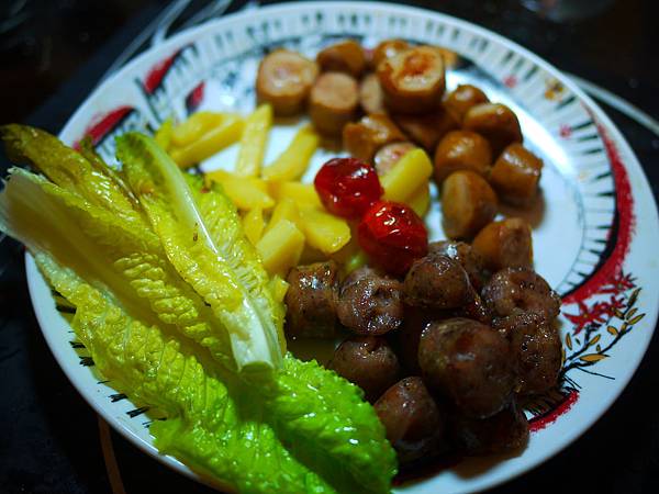 主餐是兩種臘腸,一種算是德國口味,一種是台灣口味還要配蒜頭,再加上薯條,生菜就這樣,很簡單的晚餐。